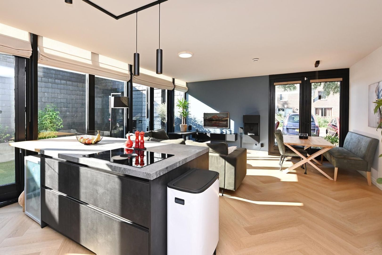 De royale woonkamer van ca. 37 m² wordt gekenmerkt door een volledige glazen gevel van vloer tot plafond die zorgt voor een zee van licht en een naadloze verbinding met de zonnige tuin op het zuidoosten. De vloerverwarming door de gehele woning zorgt voor maximaal comfort, terwijl de elektrische zonwering aan de glazen gevel het binnenklimaat aangenaam houdt. De doorlopende visgraat PVC-vloer maakt het geheel stijlvol en eigentijds.