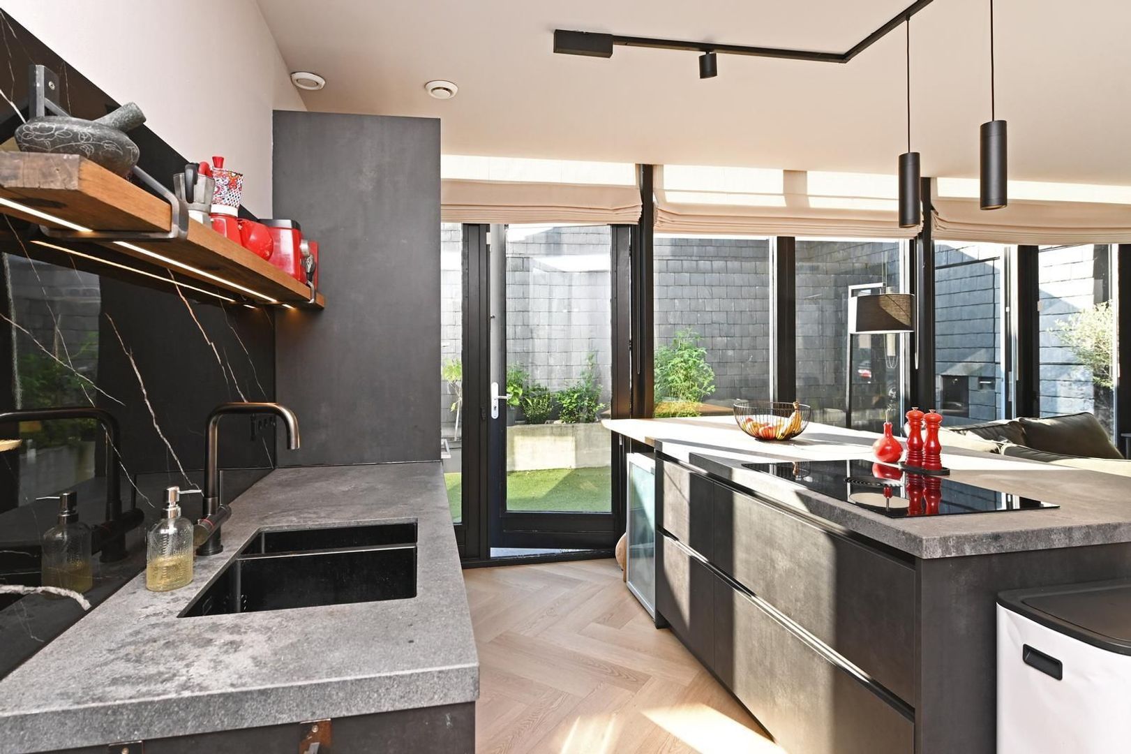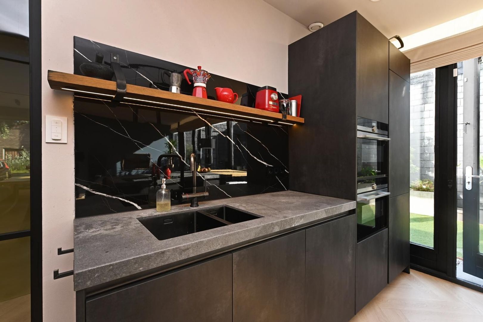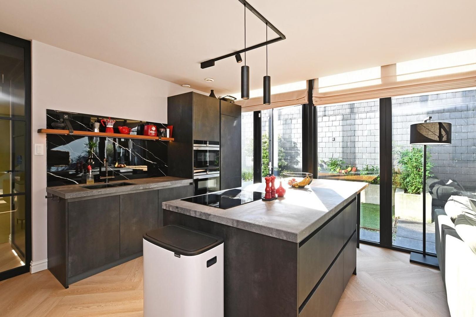 De moderne open keuken met kookeiland is een echte eyecatcher en uitgerust met luxe inbouwapparatuur, waaronder een breedmodel inductiekookplaat met geïntegreerde afzuiging, twee combi-ovens, een vaatwasser en een koel-/vriescombinatie.