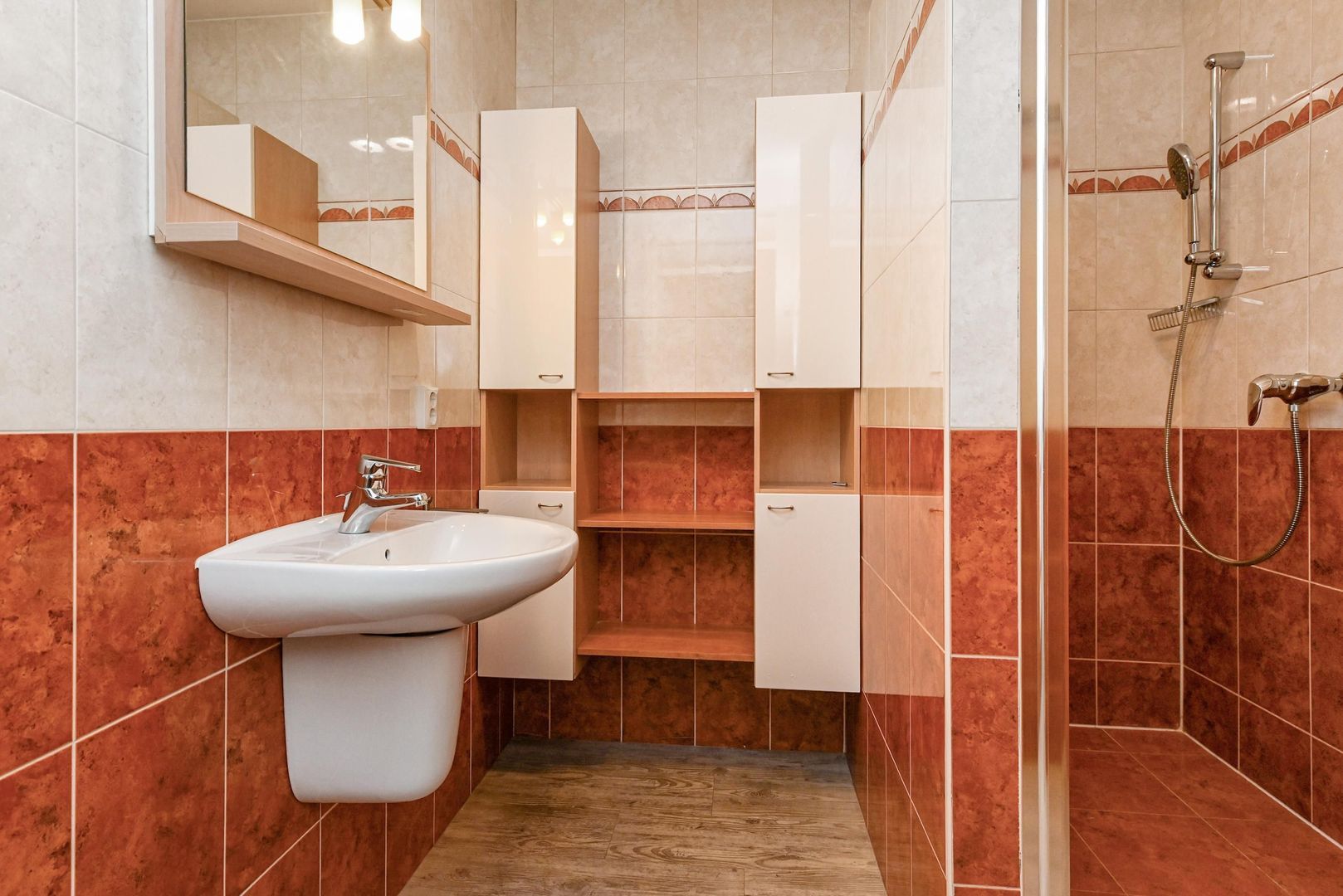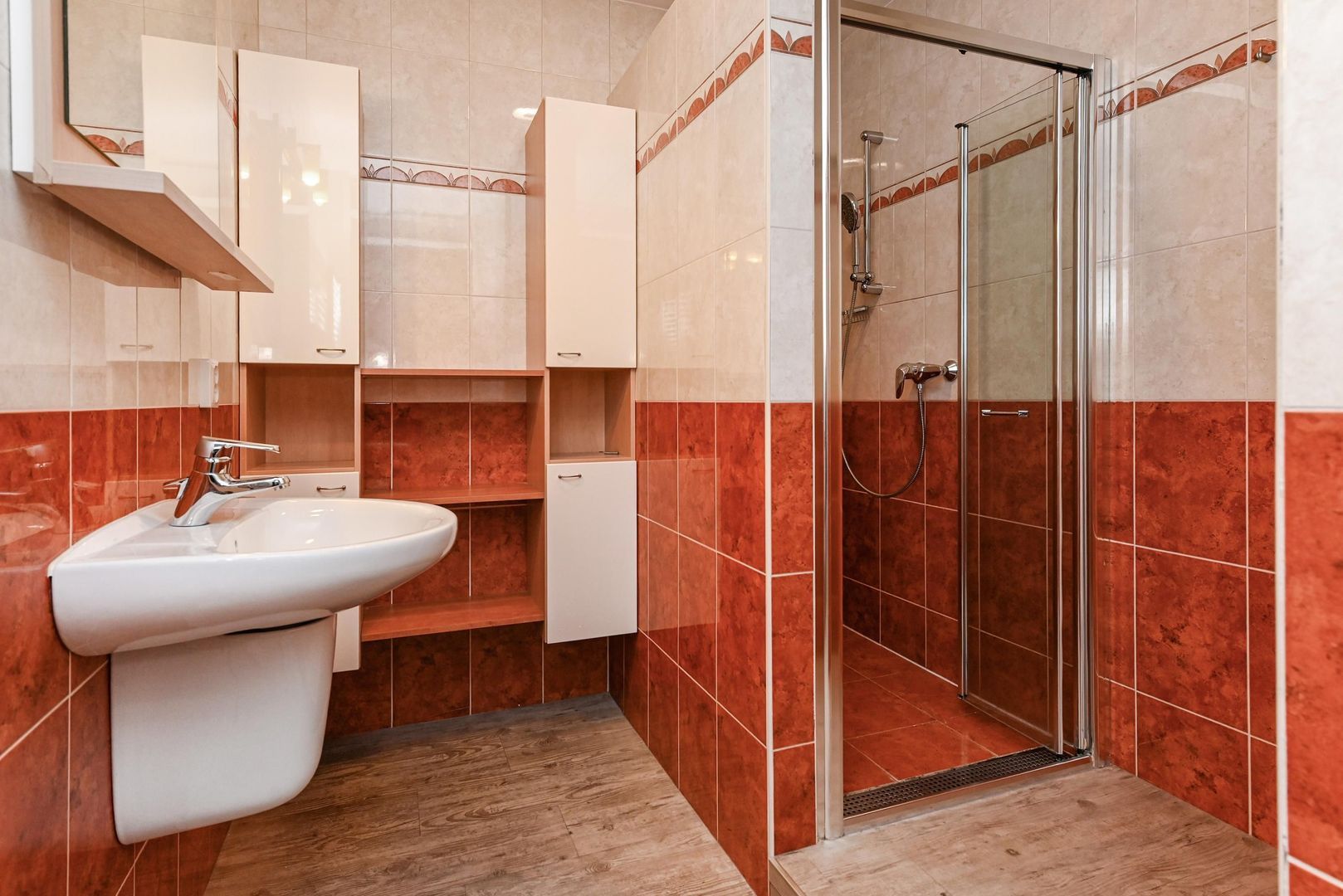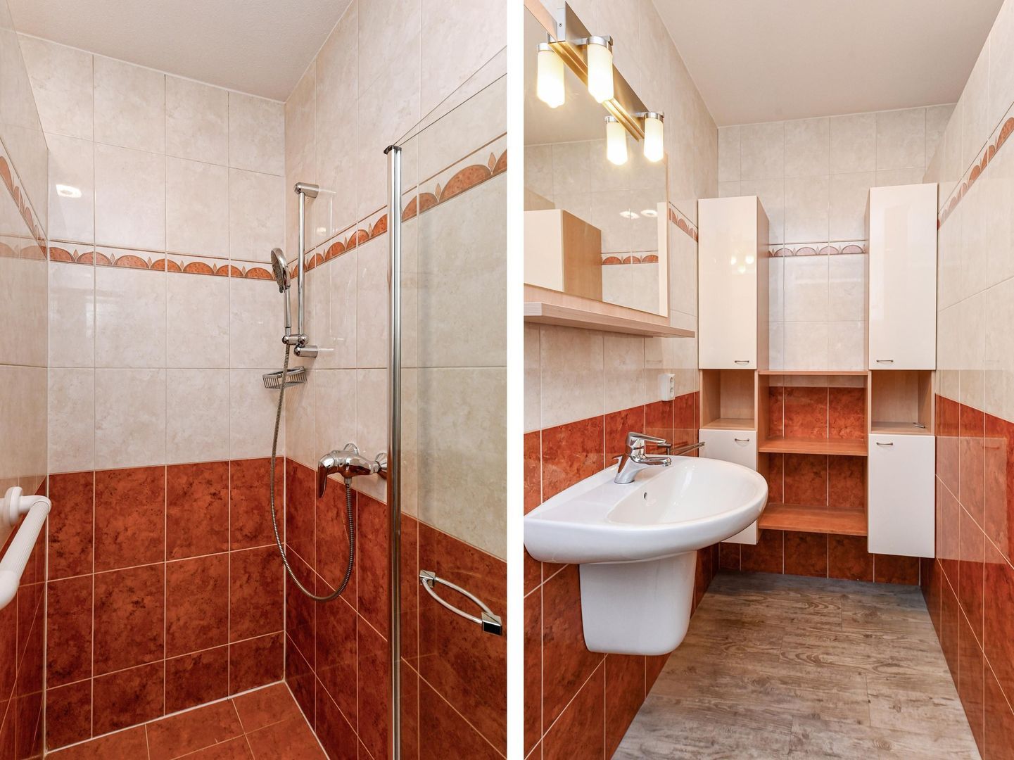 The bathroom is well-maintained and fitted with a walk-in shower and washbasin. In addition, there is a separate toilet.
