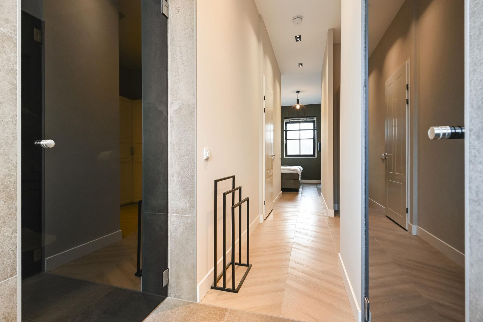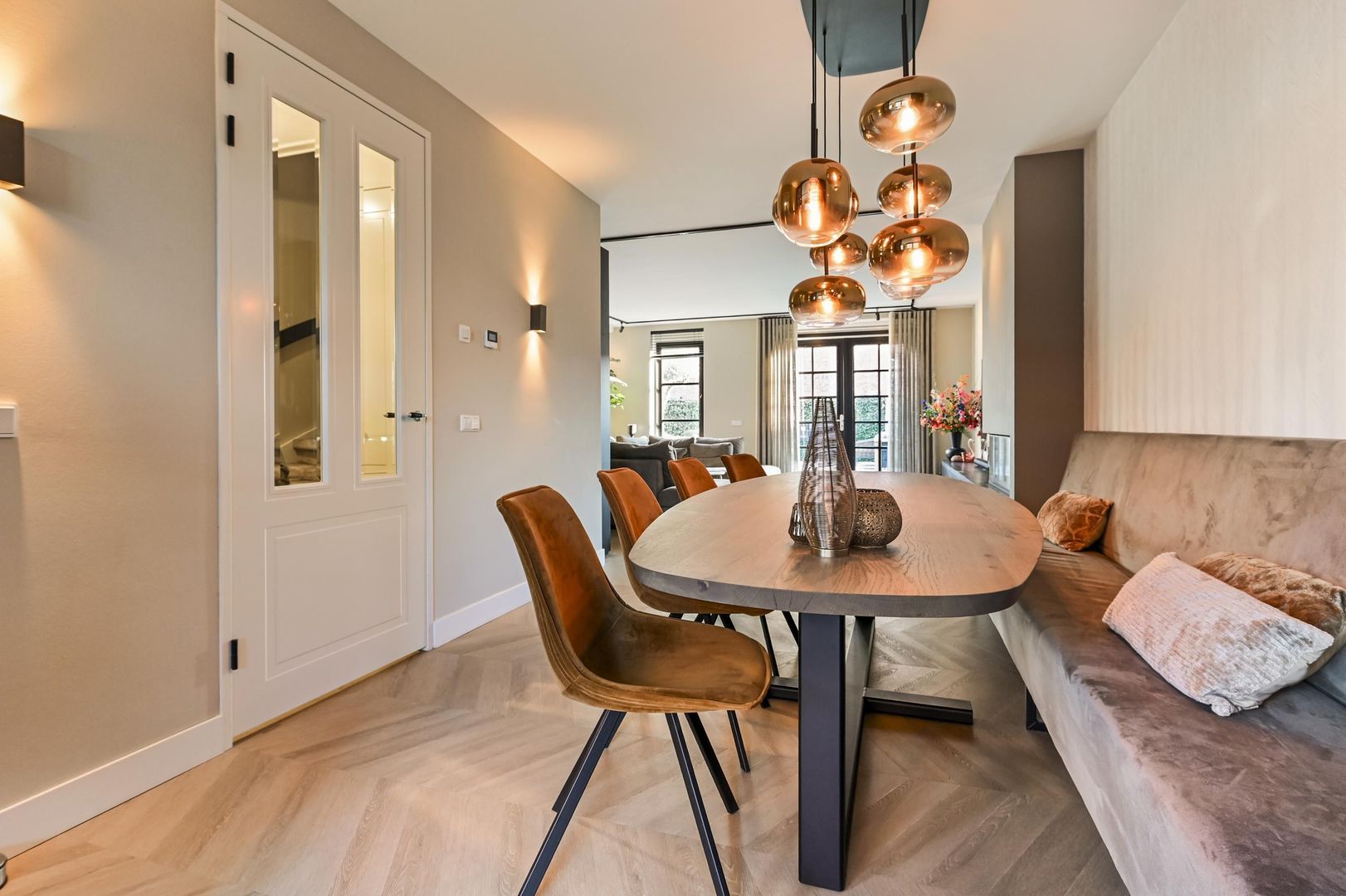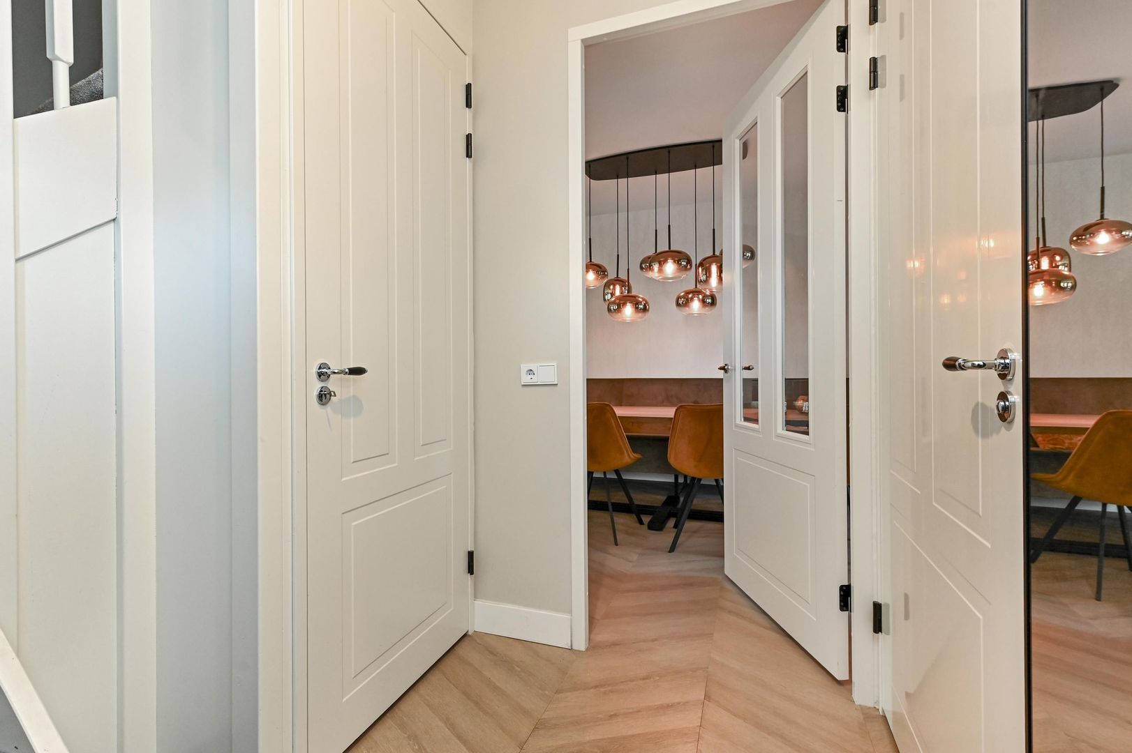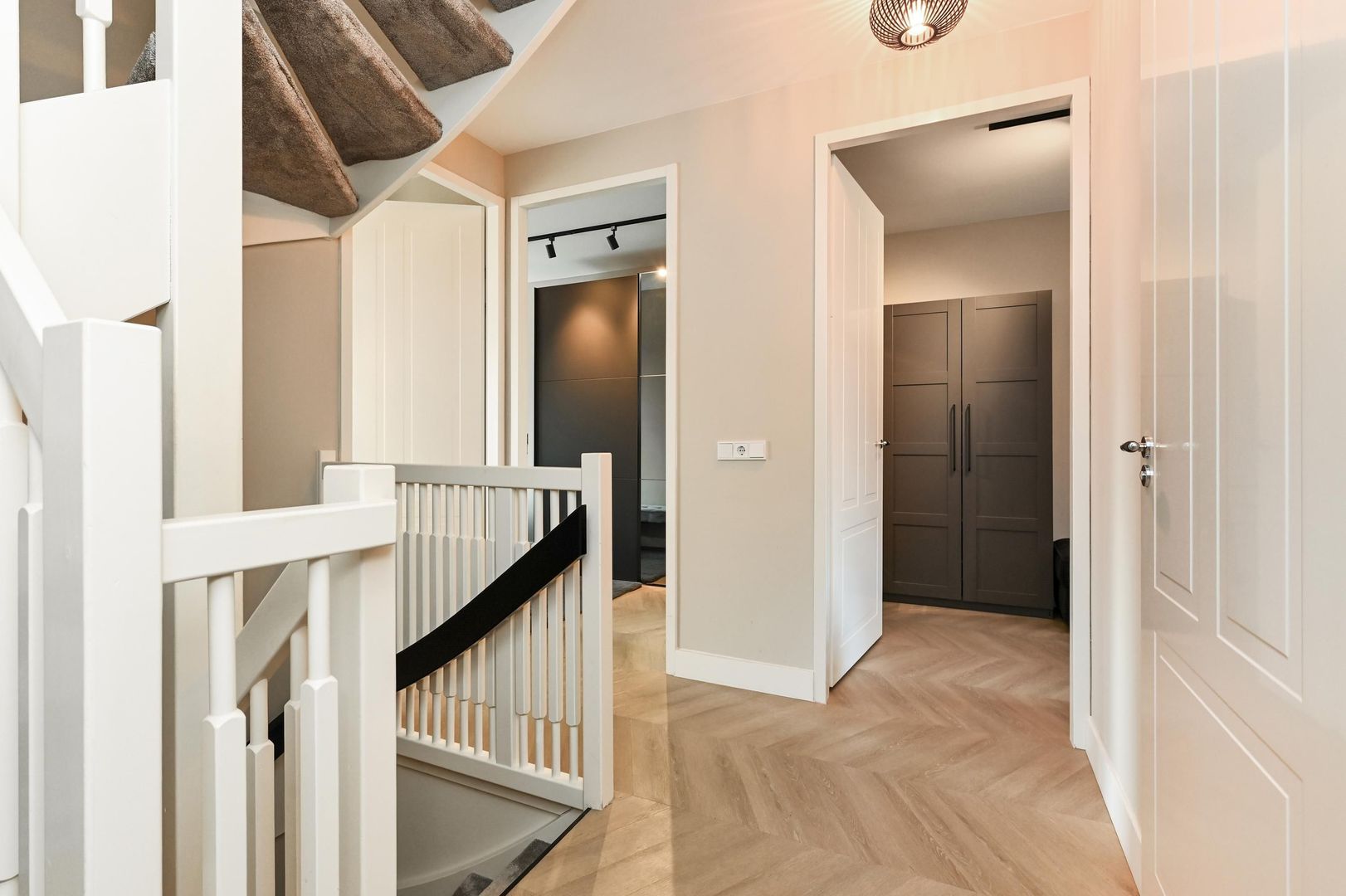 Deze woning valt direct op door de royale leefruimtes, luxe materiaalkeuzes en hoogwaardige afwerking in de gehele woning. Alle verdiepingen zijn voorzien van een Hongaarse punt PVC-vloer met hoge plinten en luxe paneeldeuren.