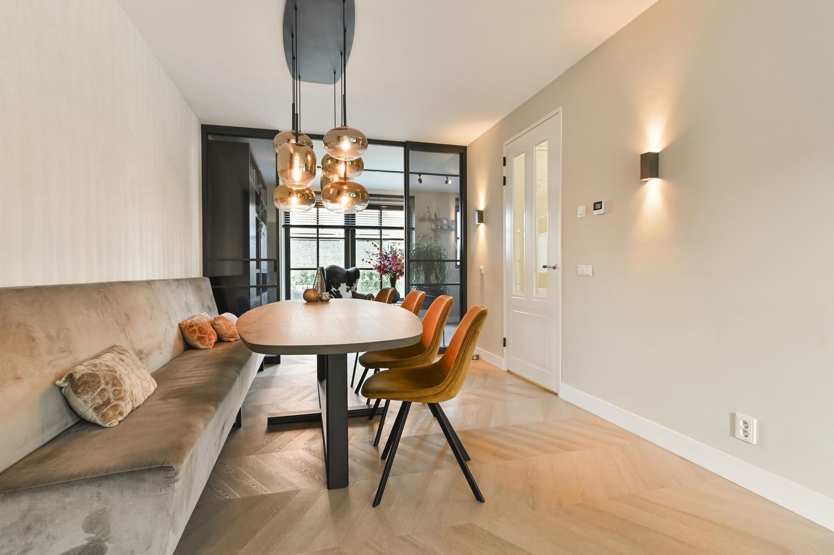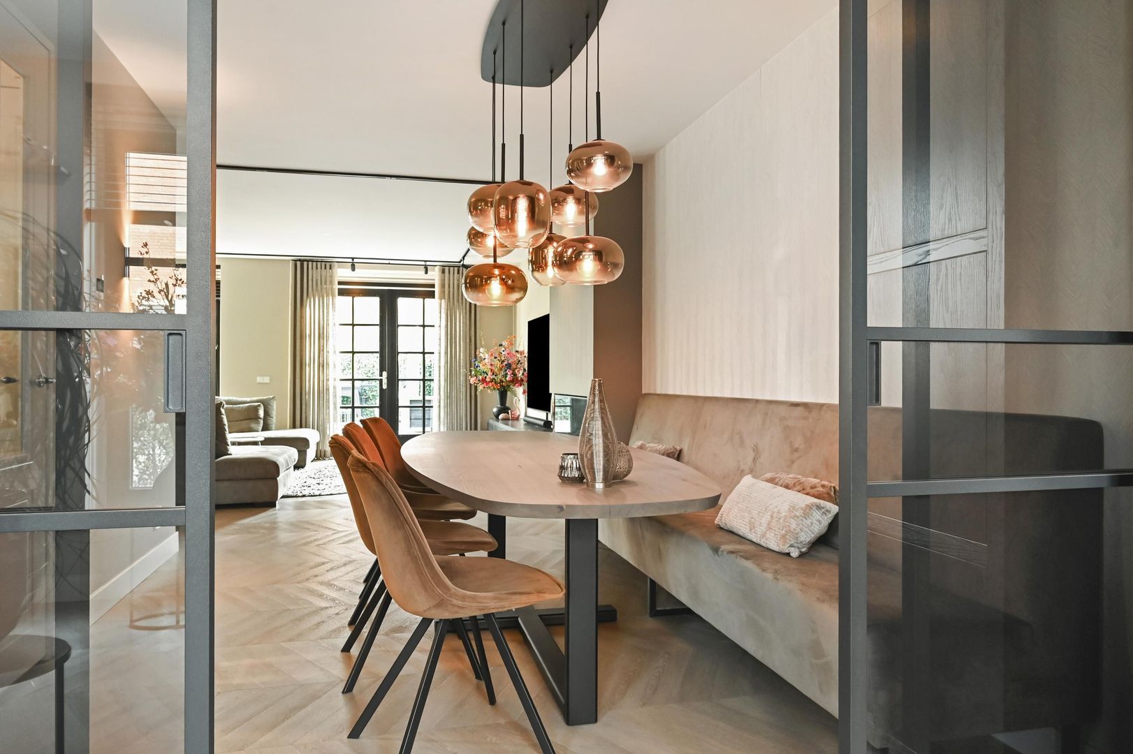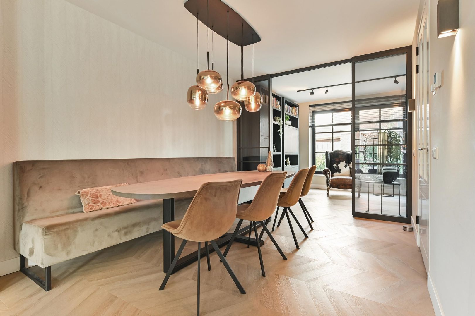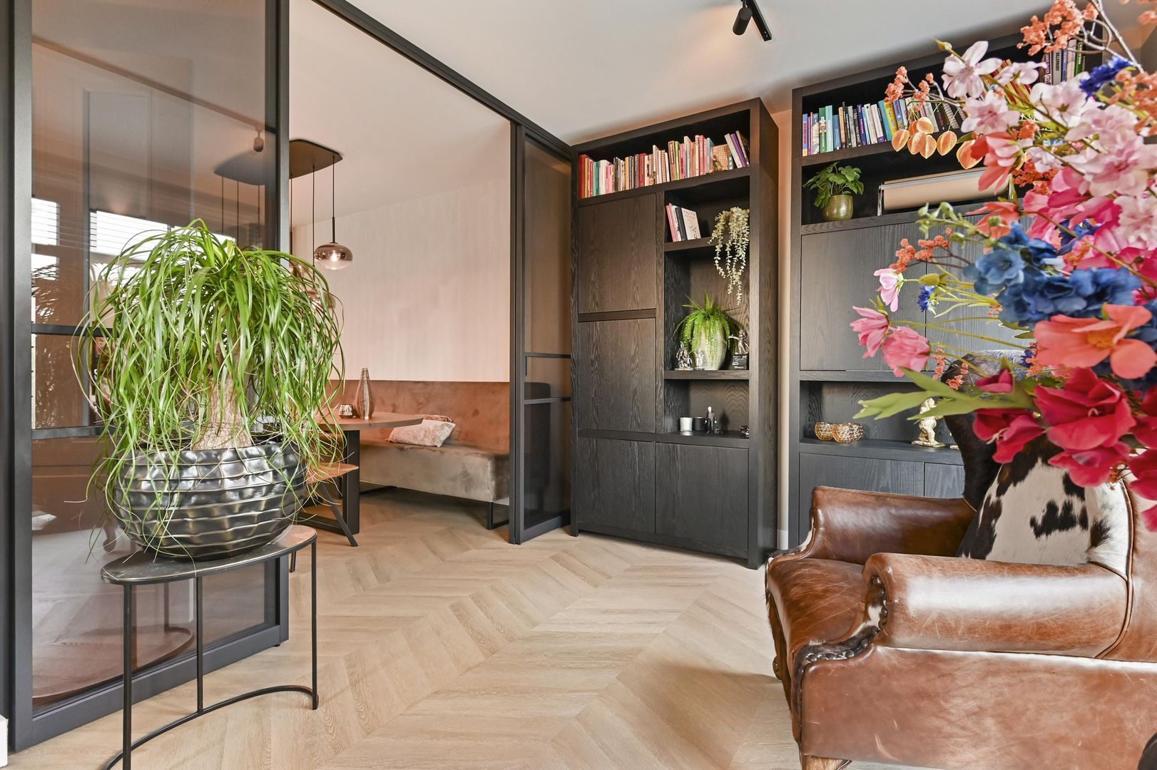Between the living room and the study you will find a luxury glass partition with steel sliding doors by Gewoon Gers, allowing both spaces to be connected or separated without losing natural light.