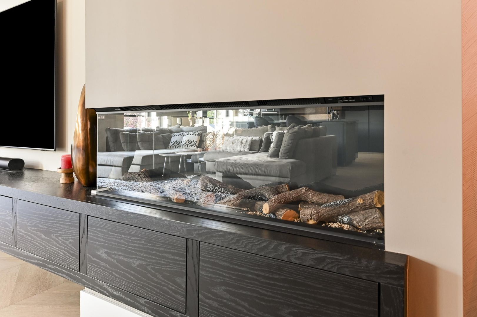 The eye-catcher is the stylish feature wall with custom low cabinets and an integrated fireplace, with the television mounted cleanly on the wall — sleek, modern and premium.