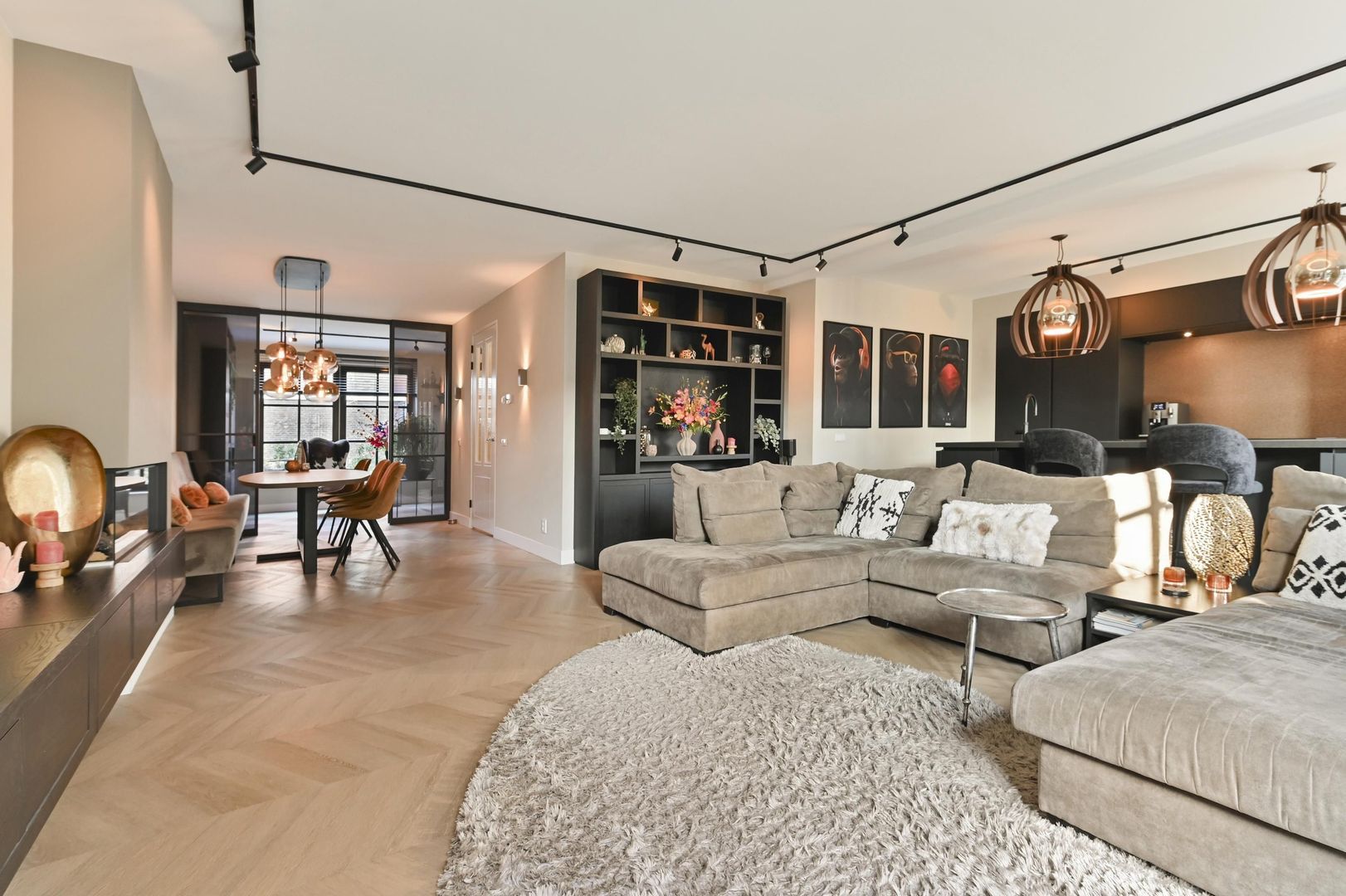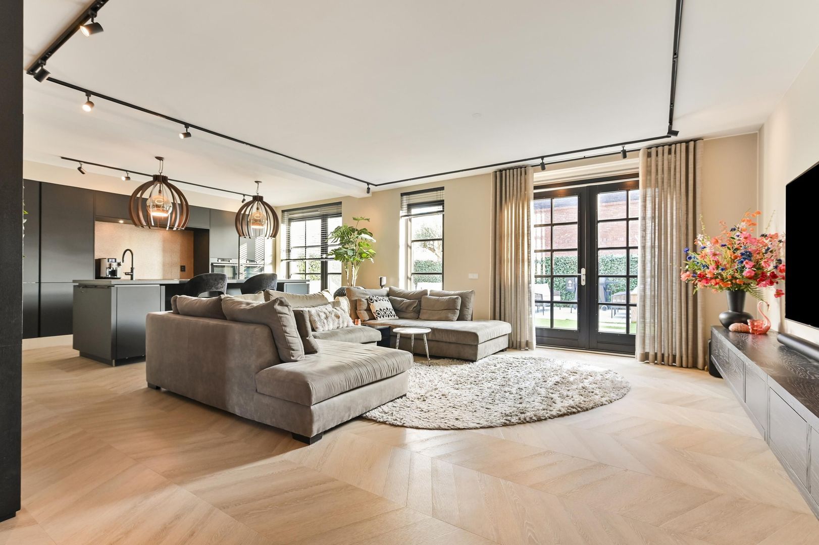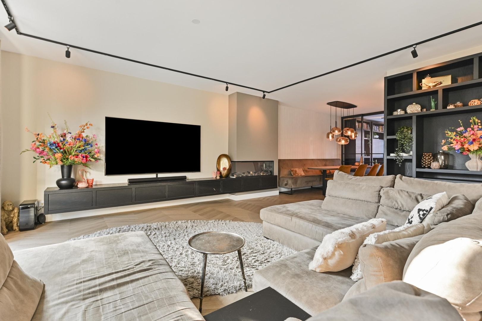 De royale woonkamer van circa 50 m² is bijzonder licht door de grote raampartijen. De blikvanger is de stijlvolle wand met laag hangende maatwerkkasten en geïntegreerde haard, waarbij de televisie volledig vrij aan de wand hangt — strak, modern en premium.