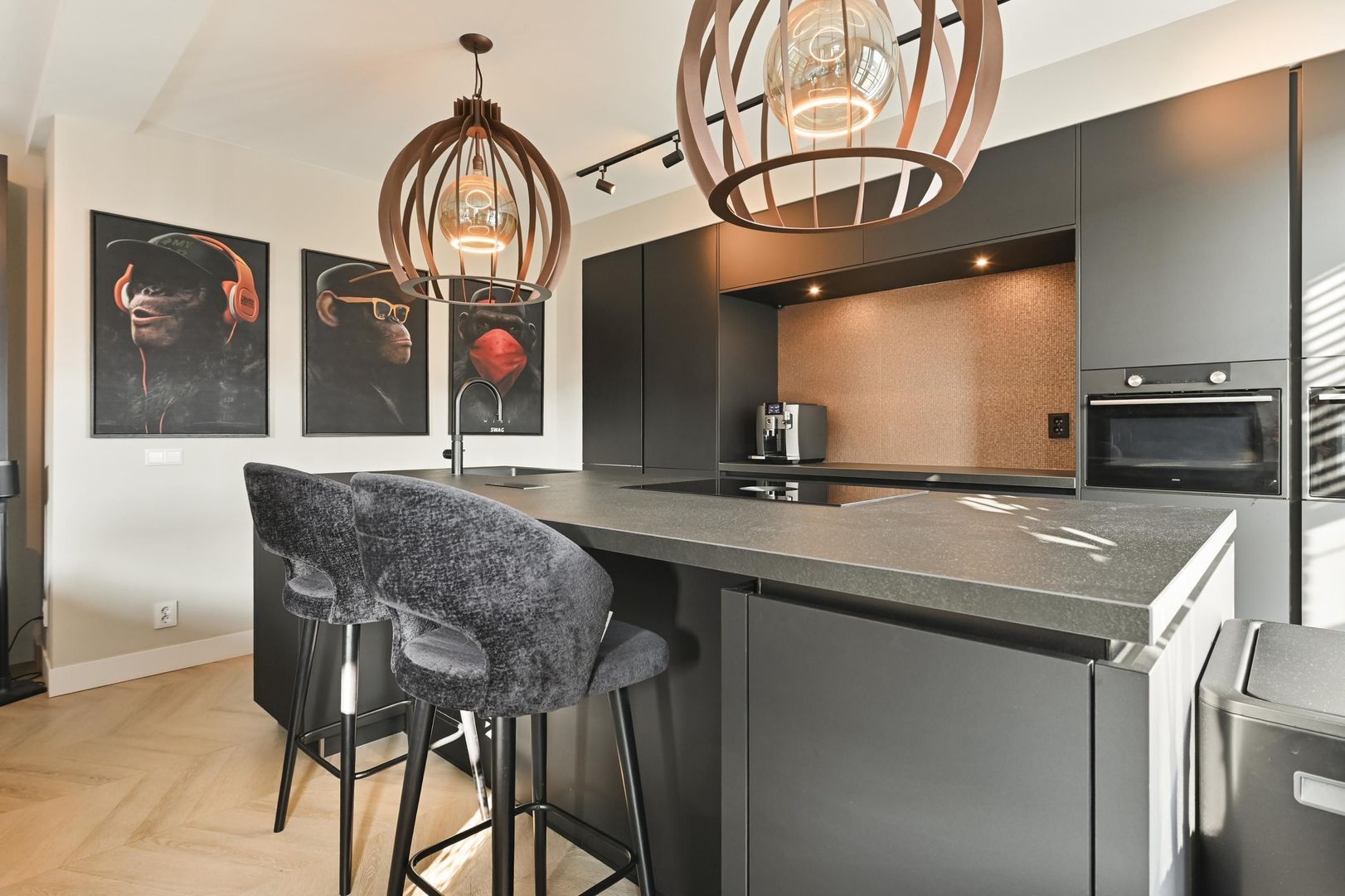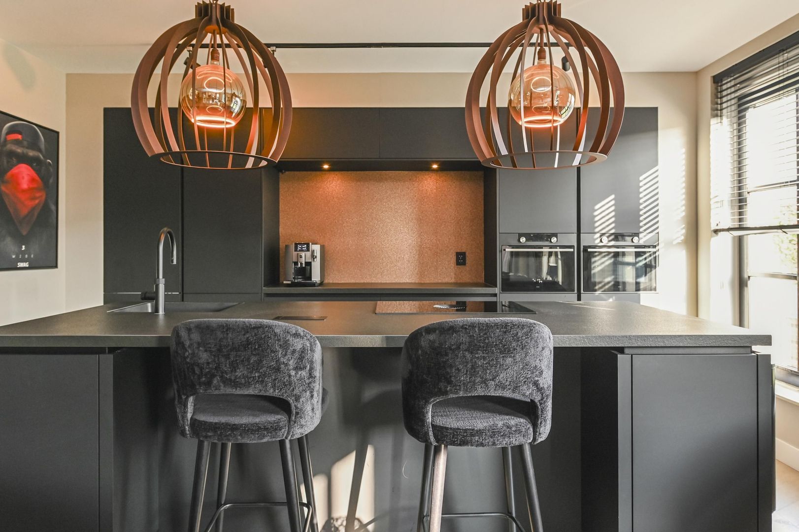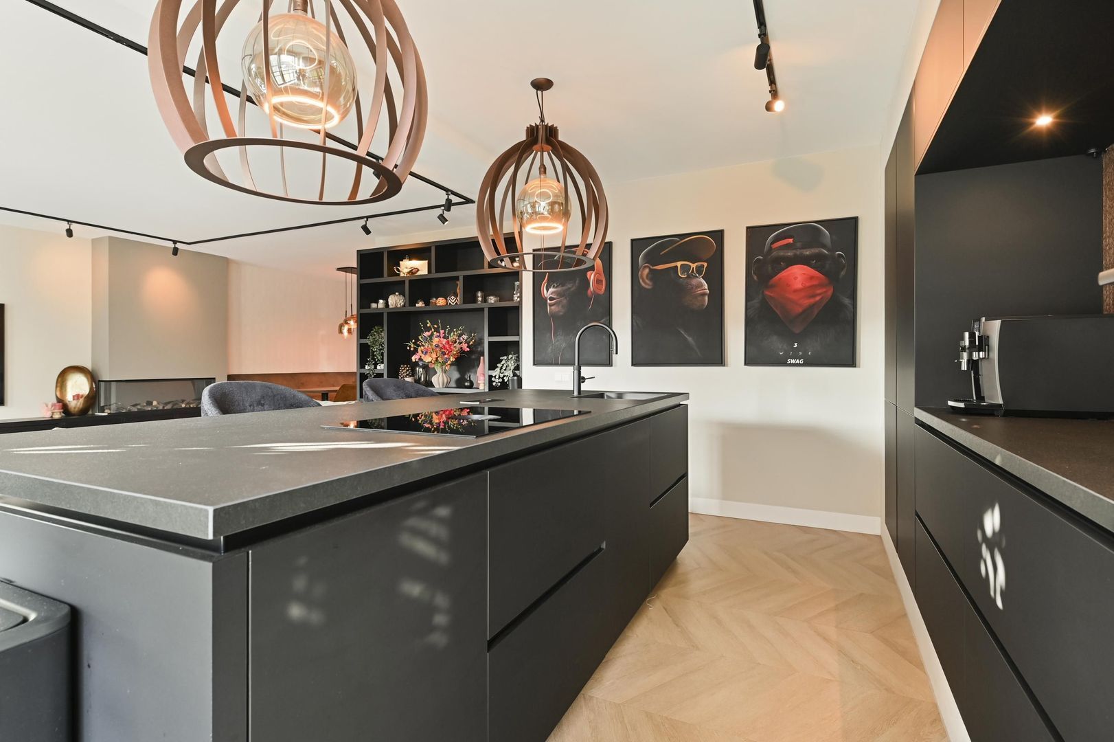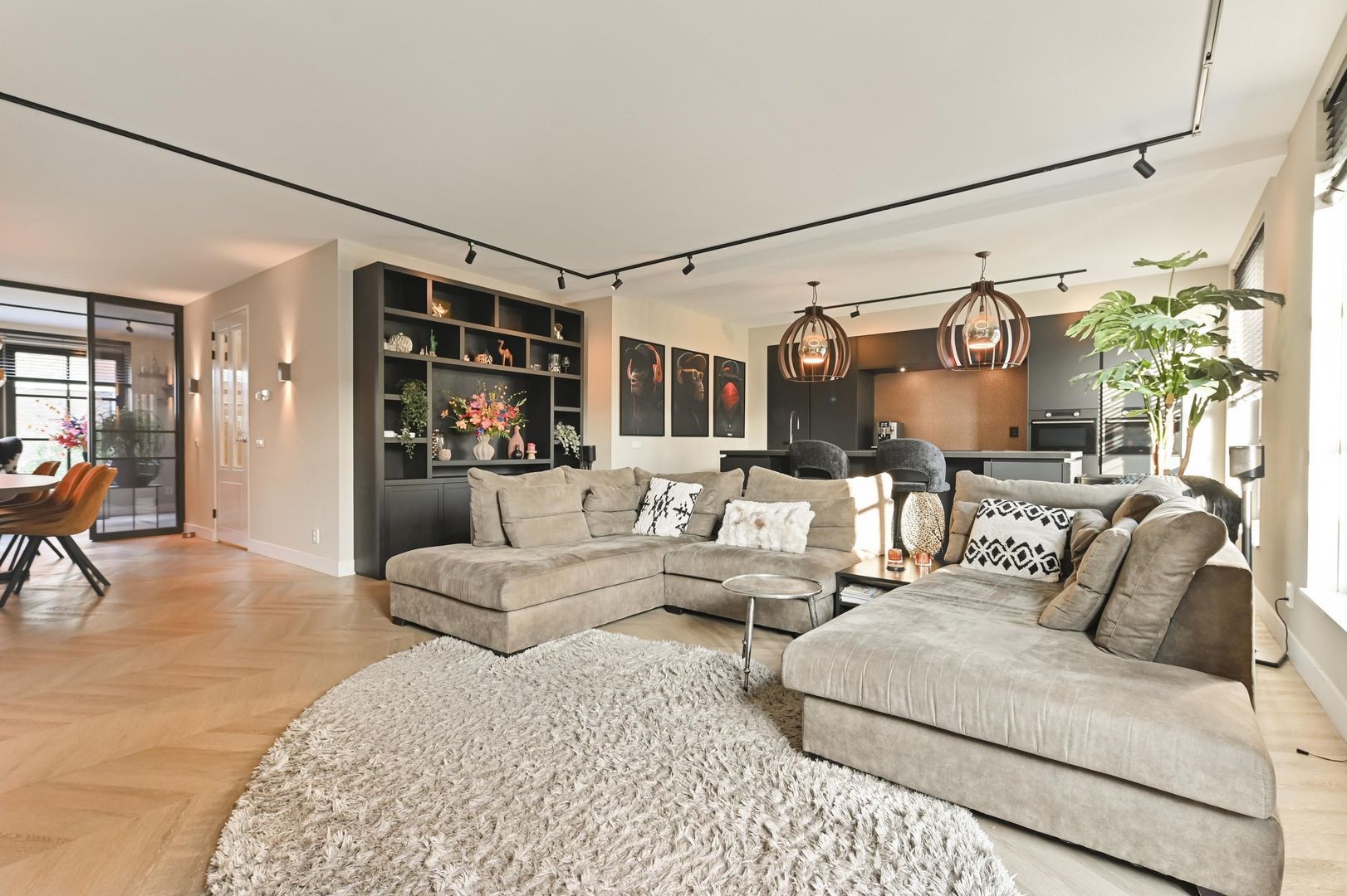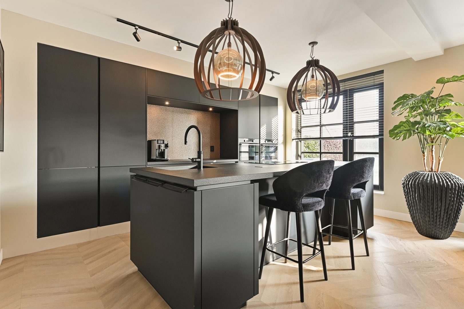 Aan de achterzijde van de woning bevindt zich de luxe open woonkeuken met kookeiland, voorzien van hoogwaardige inbouwapparatuur en genoeg ruimte voor een grote eettafel.