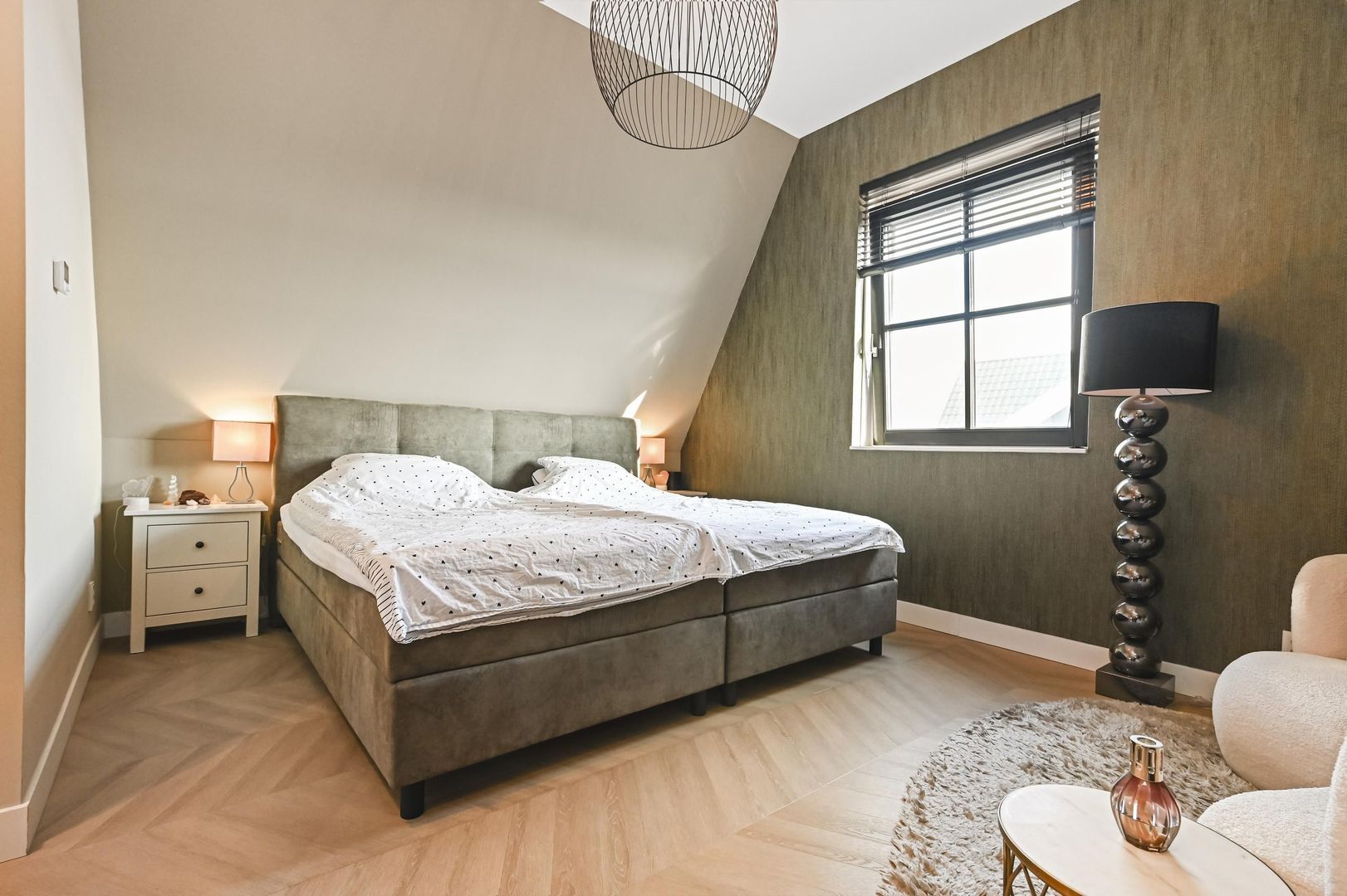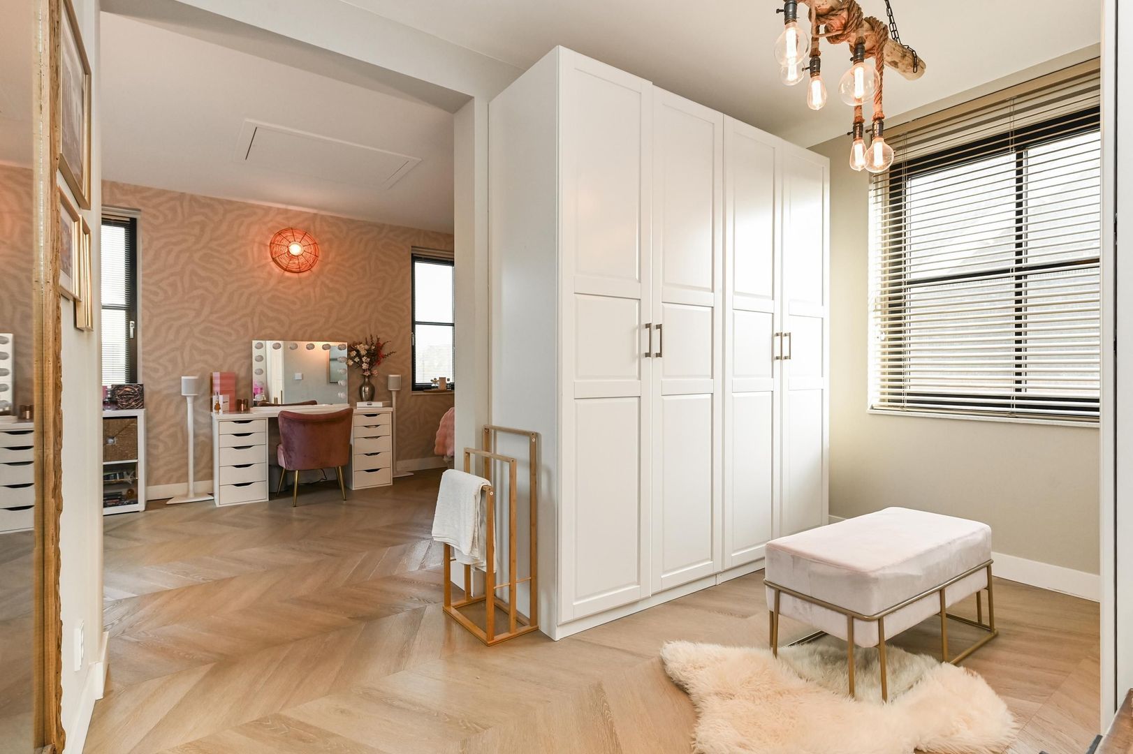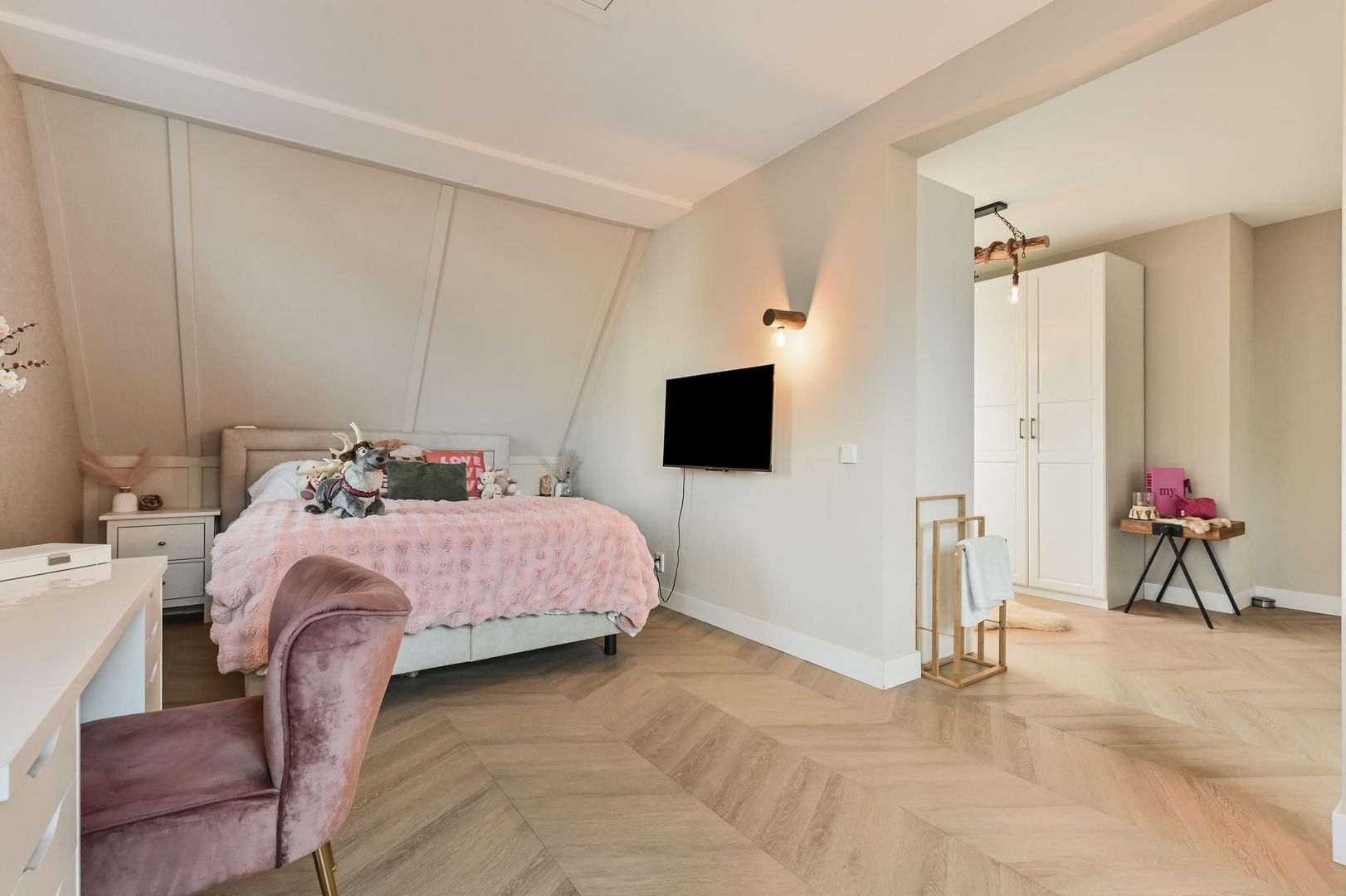 De sfeervolle hoofdslaapkamer heeft een royale inloopkast, ideaal voor extra comfort en bergruimte.