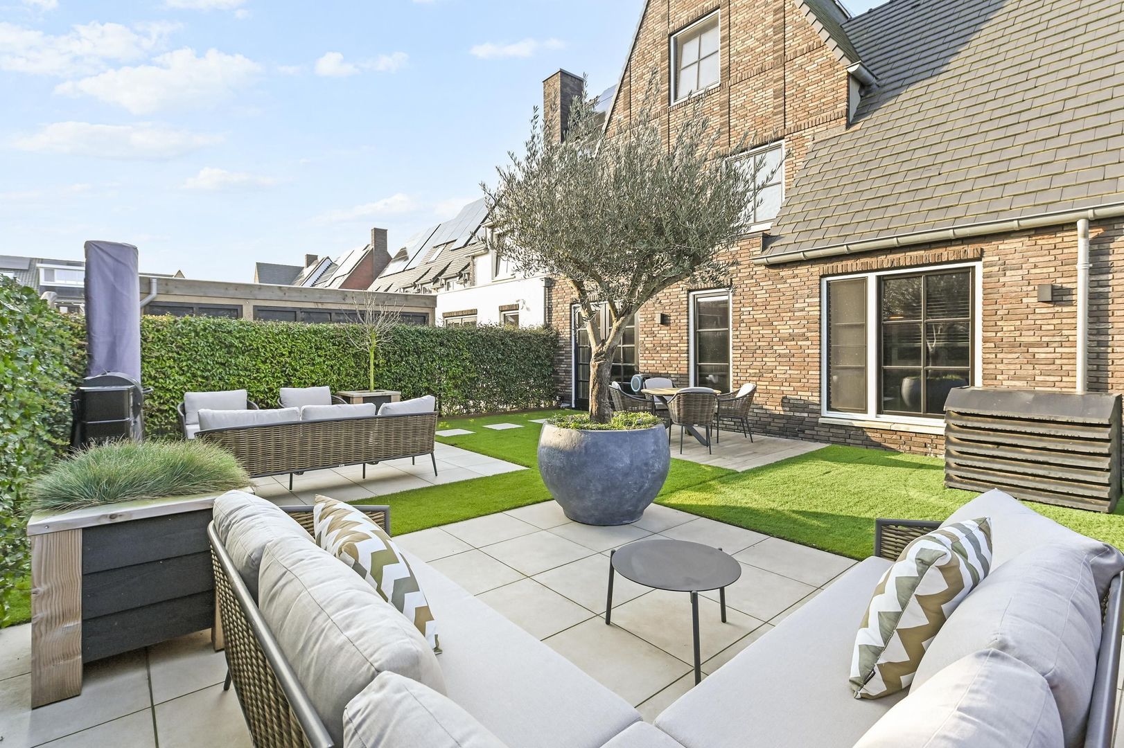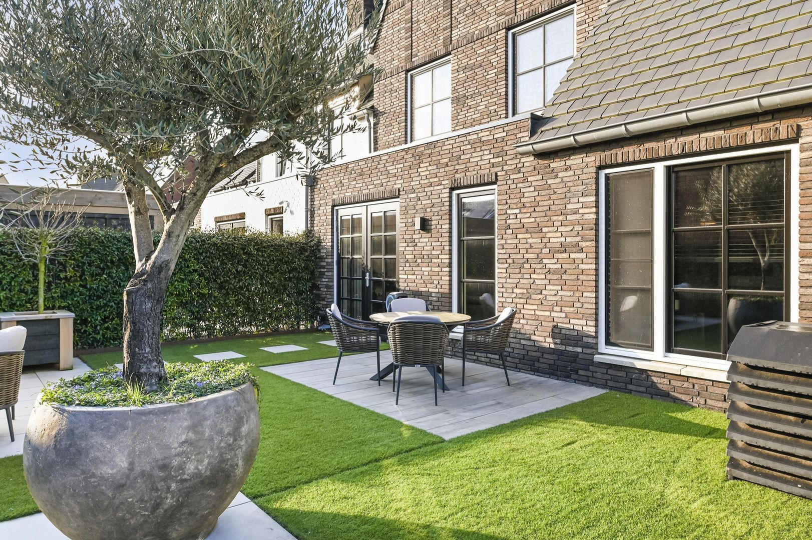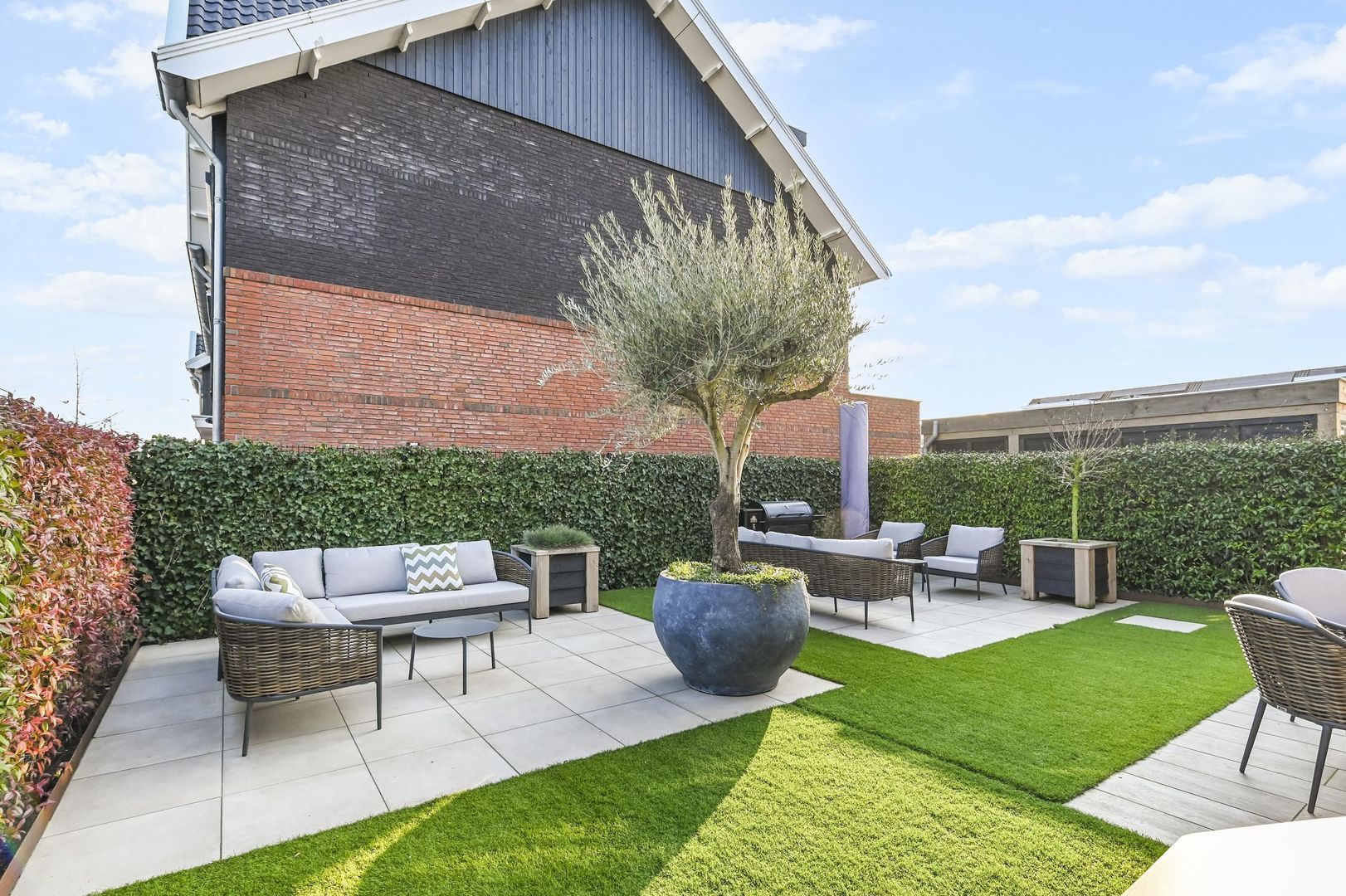 De achtertuin is voorzien van meerdere zonneterrassen, zodat u op elk gewenst moment van de dag van de zon kunt genieten. Het onderhoudsvrije kunstgras zorgt voor een altijd strakke en verzorgde uitstraling.