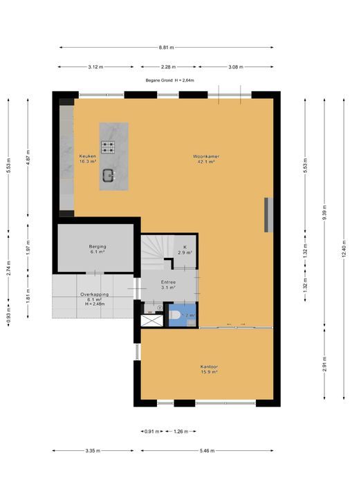 De begane grond biedt daarnaast een ruime werk-/studeerkamer en een praktische inpandige berging van ca. 6 m². De entree is deels overdekt.