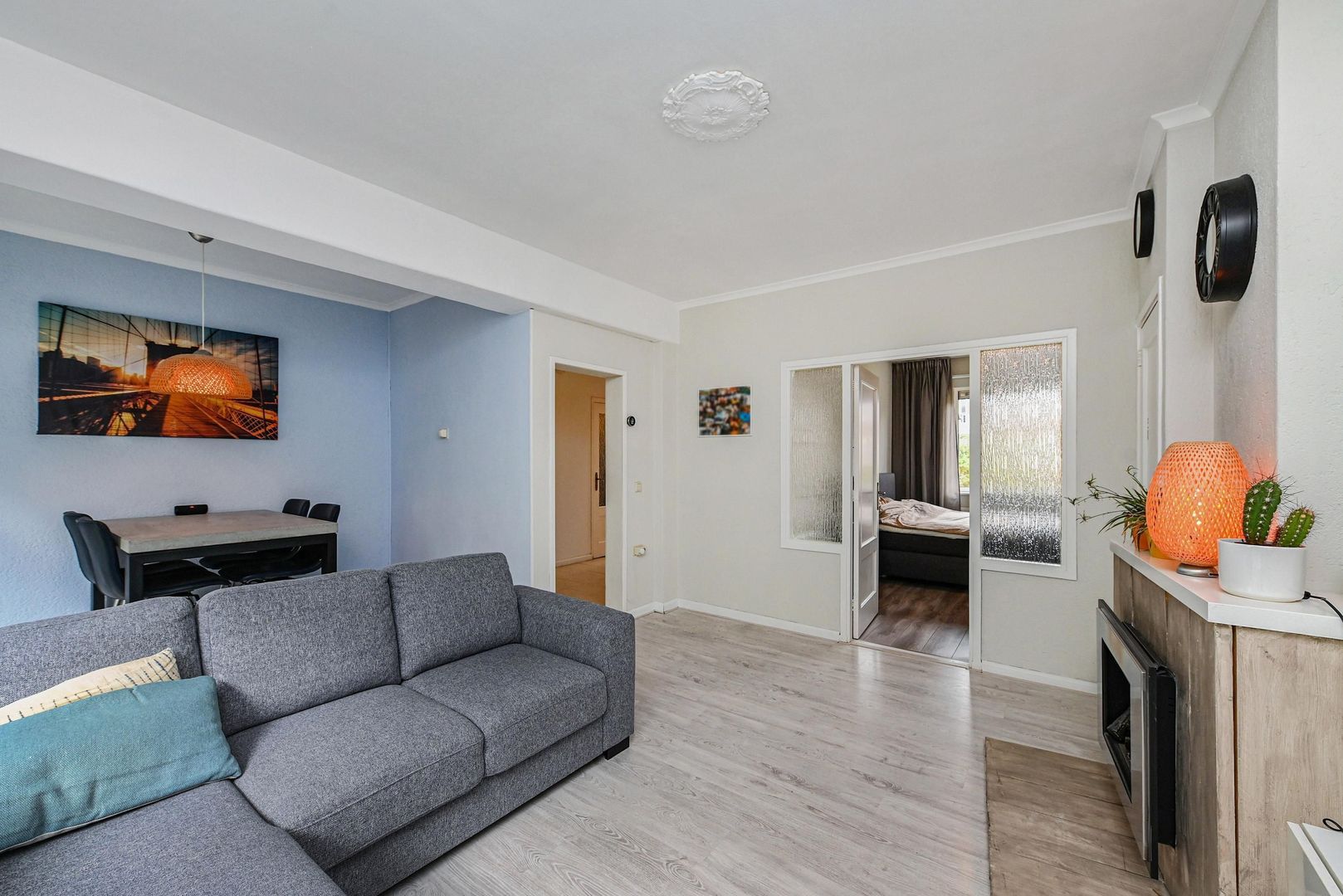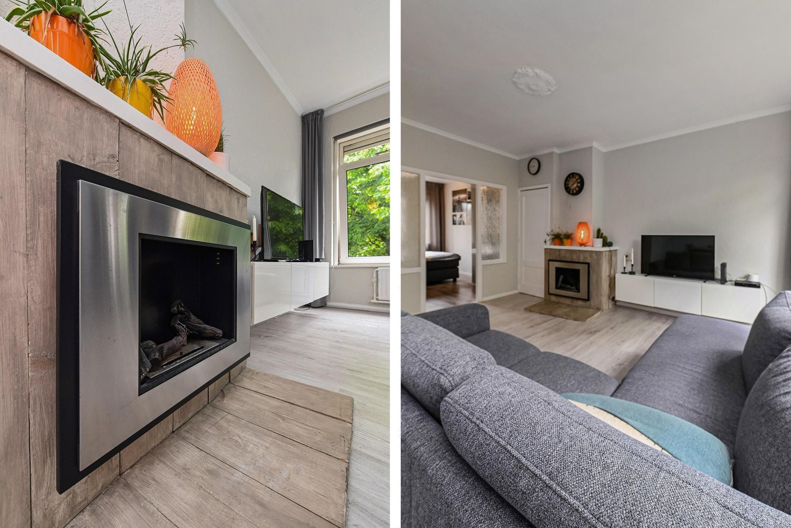 The hallway with meter cupboard provides access to all rooms. The generous living/dining room (formerly two rooms) measures approx. 5.66 x 4.53/3.02 m and benefits from pleasant natural light, a built-in cupboard and an attractive decorative fireplace. From the living room you step onto the front balcony (approx. 1.40 x 0.70 m), southwest-facing and overlooking Park Te Werve — a wonderful spot to enjoy the sun and greenery after work.