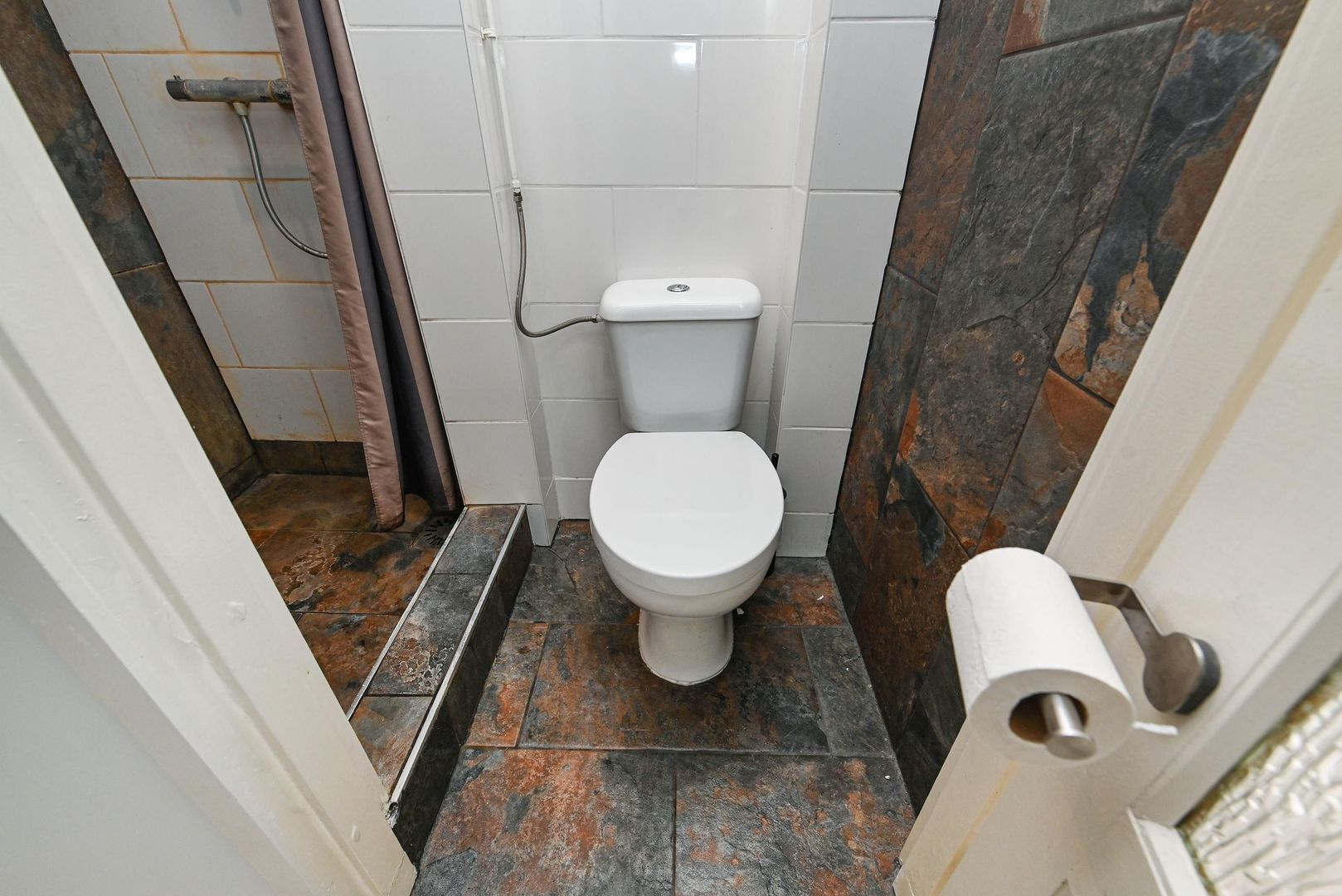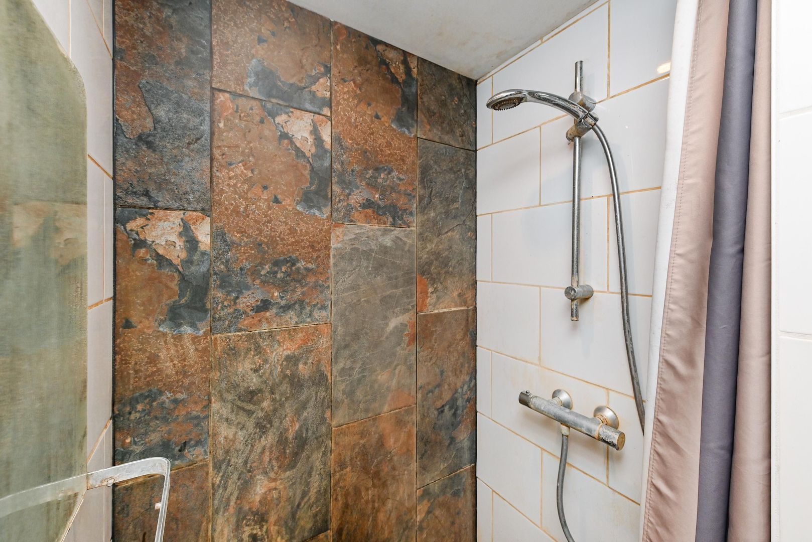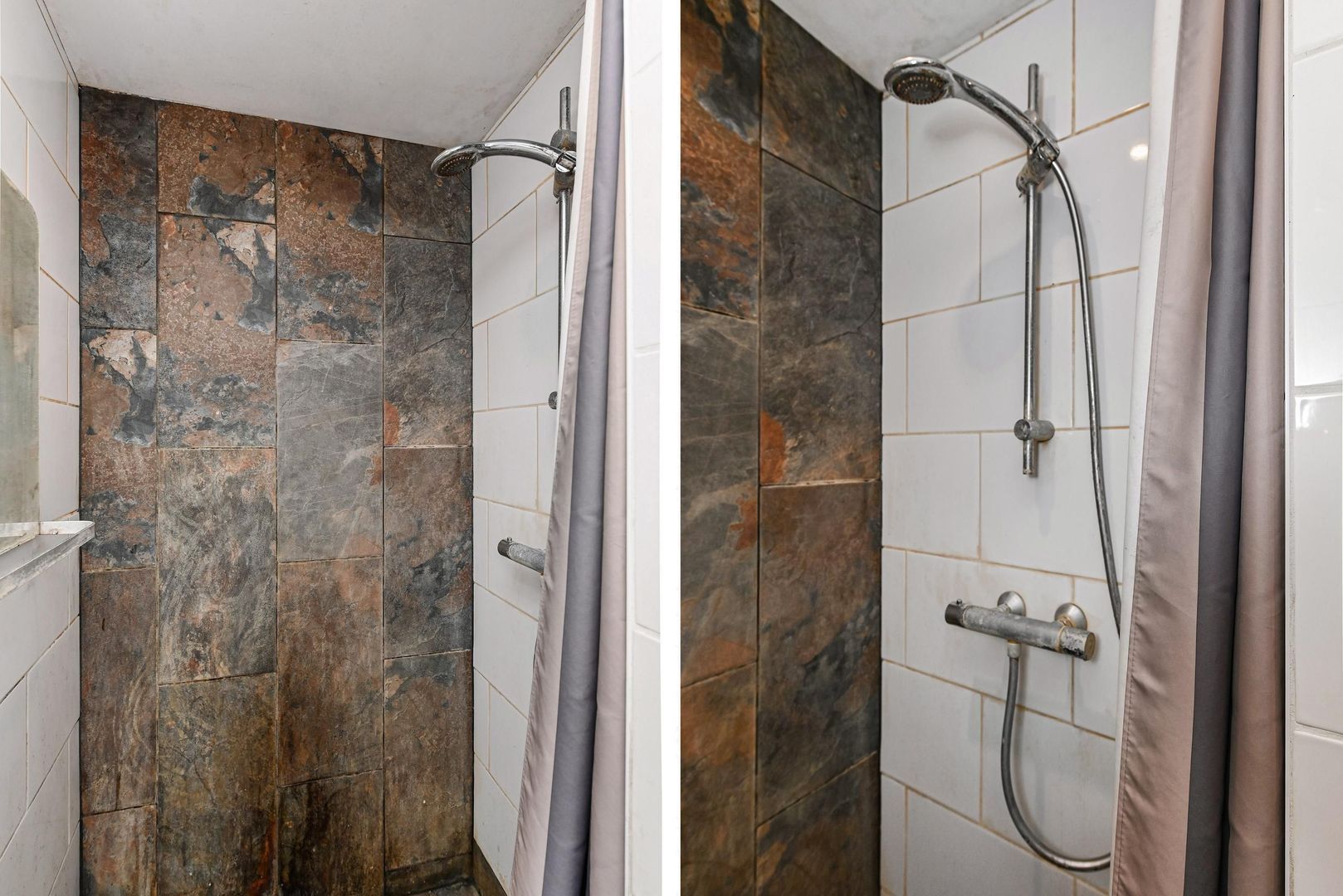 De moderne tussengelegen badkamer (ca. 1.81 x 1.05) is strak afgewerkt en beschikt over een ruime inloopdouche en een toilet.