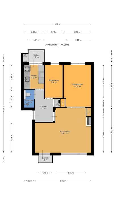 Het appartement beschikt over twee goed bemeten slaapkamers. De hoofdslaapkamer (ca. 4.26 x 2.77) is voorzien van een vaste kast. De tweede slaapkamer (ca. 3.33 x 1.78) is ideaal als werk-, kinder- of logeerkamer.